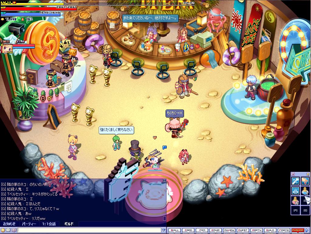 ひまねこ@コルホーズにぶちこむぞりある記です。 myPC設置につき更新中です。 レイヤーやってまsPAGE | 20 21 22 23 24 25 26 | ADMIN | WRITE 2007.08.03 Fri 01:15:24 紅が><2007.08.02 Thu 22:58:31 Tベルセッティーサマと隣の家のネコサマブルーミングコーラショップにて・・・ 行ったらいきなり攻撃ですか・・・ しかも私のお墓が・・・!? ちなみに『Tベルセッティーサマ』と『隣の家のネコサマ』が参加者(?)で^^; 爆竹のような物で攻撃を受けて・・・;(ぁ お花まで・・・ありがとうございまs(ぇ お次は針かぃいいい!!! ということで^^; 何気に一回終わったと思えば二次会ですか(ぁ ぐっさぐっさ刺されてます。(ヤバス いじめの的・・・><? 最終的にのろいの人形を置かれて、 リスがかじっているという・・・ ぬこさんが言うまでキツネと勘違いしていました・・・^^; リスのお面 Lv.40 から装着可能ですv(豆知識 イベント延期らしいね、ってぬこさんが。(ぁ 14日までらしいからRUNOAとカエルくんも参加できると良いね^^* というなにとなく清々しい(?)気分になったところで、 終わりやす!!!!ばいびー^^ノシ 2007.08.02 Thu 18:09:51 うあぁあ;今日ある場所のお祭り中止だって・・・><